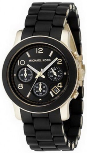 Black is always classic and Michael Kors updates this standby by wrapping the case and bracelet in sporty polyurethane. The glossy black dial is striking with the shiny gold-tone numerals and indexes.
